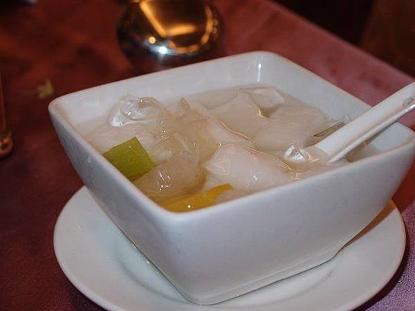 最後招待的杏仁豆腐,口感非常特別,豆腐吃起來Q彈有咬勁,加有雪耳及芒果的甜湯,但老婆不喜歡。