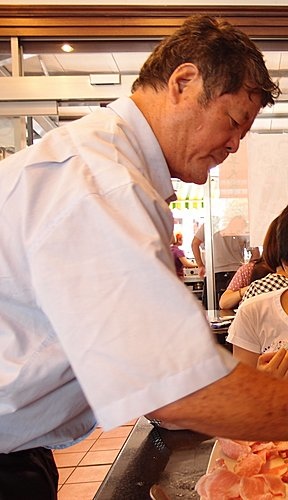 鐵板松板豬肉及霜降牛肉各一份(每份$160),老闆很友善,親力親為切肉,並親自為客人烤肉。