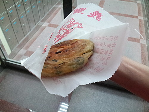 先去義豐蔥油派,位於民生路郵局旁,只要仰頭望著大大的麥當勞霓虹招牌便很容易找到。可能時間尚早,沒有長長人龍。可以立即再買多個,不用再排隊。