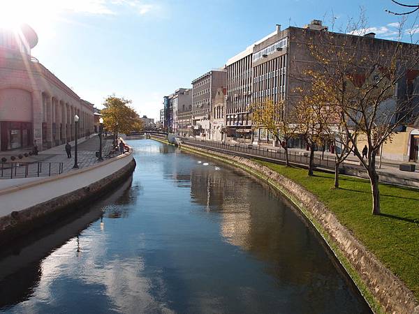 波圖Sao Bento站往 Aveiro 班次很多, 可選擇不同車種 (50-65分鐘)。由於我們時間充裕, 所以選擇了慢車 Urbano (65分鐘 €3.4)。3點多到達Aveiro, 火車站內果然沒有儲物櫃, 站內店舖亦比較早關門。 只好先帶著行李往市中心走。步出火車站天氣很好。
