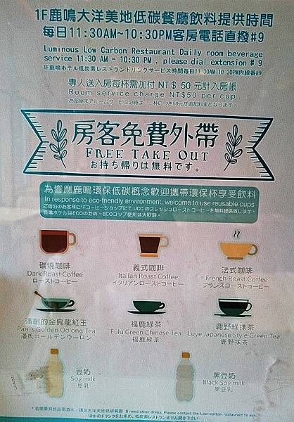 酒店的餐廳有無限免費供應指定飲品, 還可以自備杯外帶, 飲品可以選擇咖啡、綠茶、烏龍茶、抹茶、豆奶等。