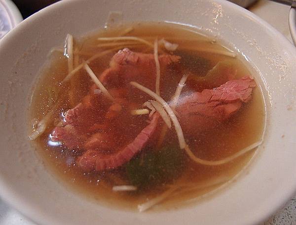 另一種食法是當地人推介的台南牛肉湯食法, 碗內先放1-2片牛肉及薑絲, 再加入滾熱的湯底, 令牛肉轉半熟即可食用, 牛肉更嫩滑, 湯頭更變成牛肉湯渴下。