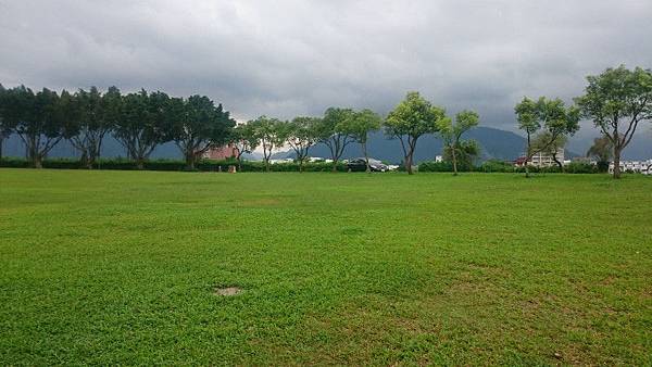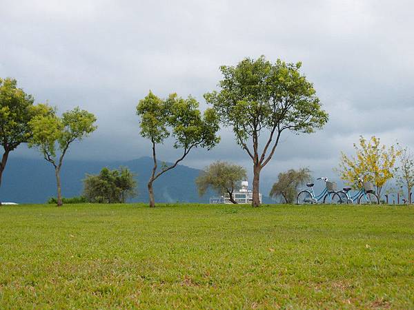 到民宿放下行李, 在同棟的大坡池渡假會館租借單車, $150可以使用24小時, 明早騎去伯朗大道無需額外付錢。騎去大坡池只需5分鐘, 但中途開始下雨, 只好躲在民居簷篷。屋主很友善跟我們搭訕談池上米, 更拿櫈給我們休息。避雨幾分鐘後雨勢減弱, 再出發到大坡池。