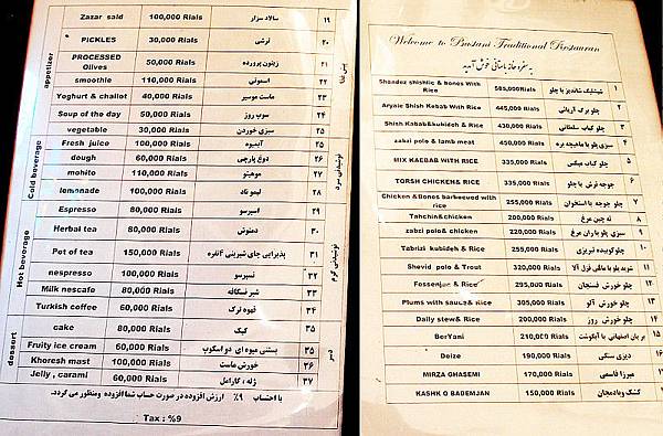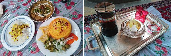 我們點了一道比較特別的 Tahchin, 是番紅花飯包著雞肉, 煮好後翻轉器皿把飯倒出整份飯, 表面有薄薄一層脆飯焦, 味道不錯。飯後還點了一壺茶, 茶本身略苦微澀味道一般, 使用伊朗人地道方法加糖飲用, 茶具很精美。埋單 58k Toman, 但味道不及昨晚的 Shahrzad。
