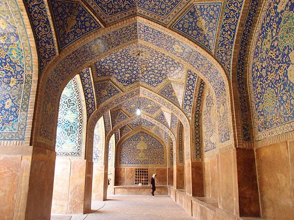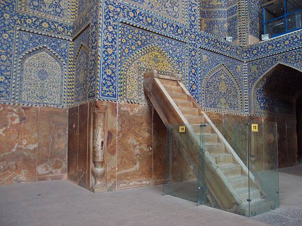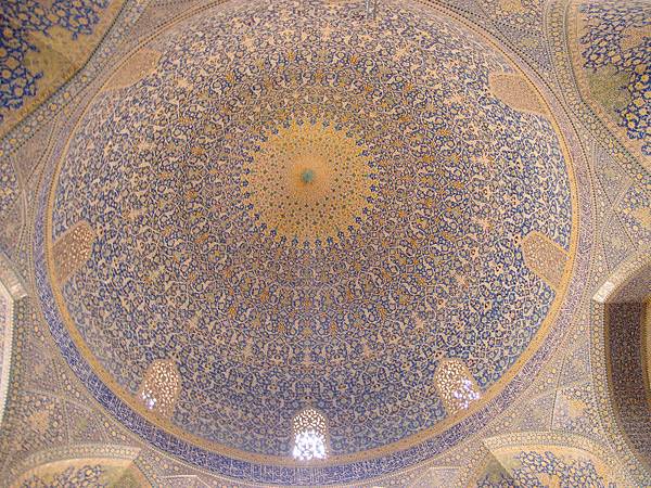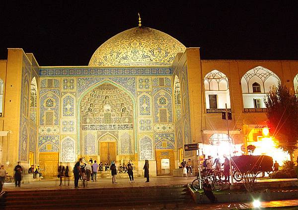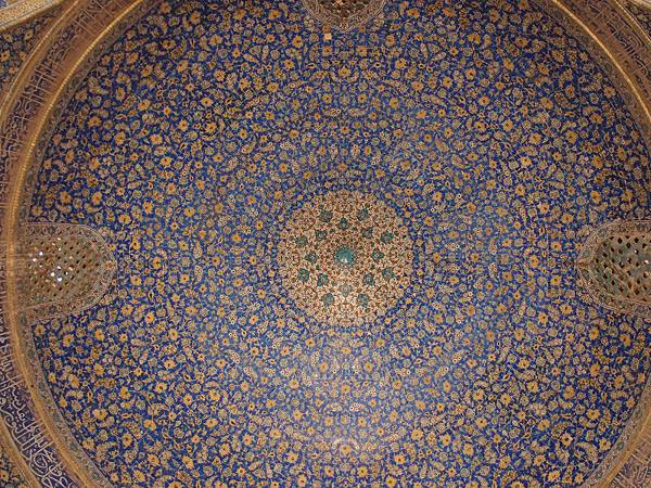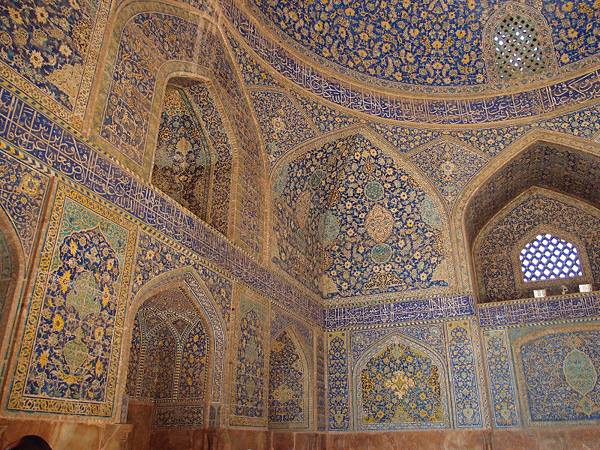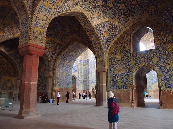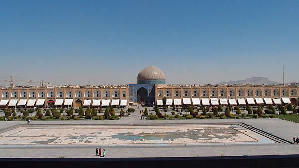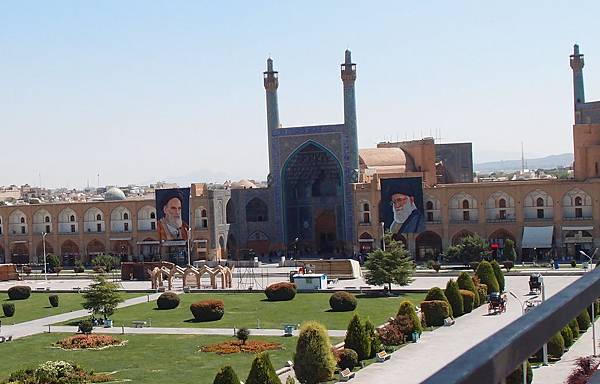 伊瑪目清真寺 (Masjed-e Imam, مسجد جامع عباسی ), 正門跟院體呈現約45度角不是平行, 因為正門面對廣場, 清真寺則面對麥加。清真寺於1629年建成, 佔地17000平方米, 是伊斯法罕最大的雙層拱頂清真寺。早上遊人比預期少。