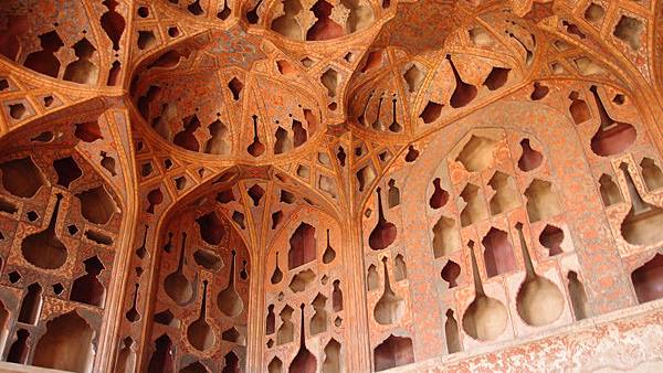 牆壁裝飾保養一般, 壁畫模糊不清。參觀阿里卡普宫最吸引是走樓梯往平台, 是眺望整個廣場及清真寺絕佳位置。