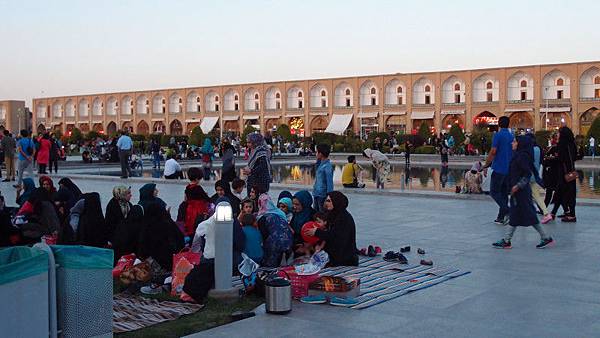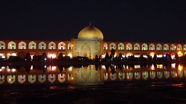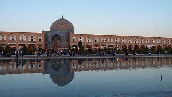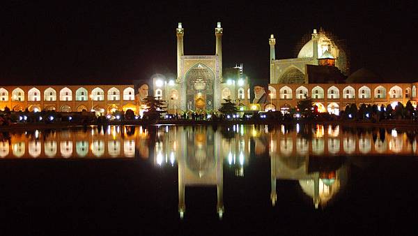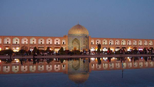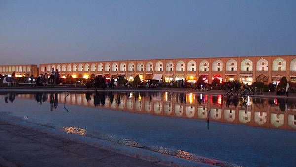 在酒店休息到6點半再出動到伊瑪目廣場看夜景。7點前到達廣場, 中央水池放了水。