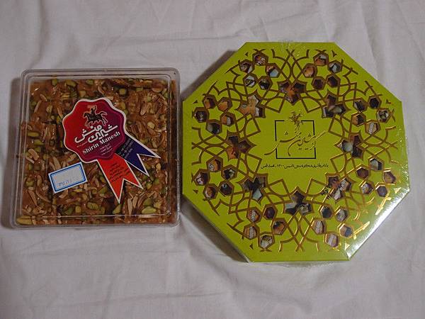 在巴扎小巷內四圍逛, 在售賣布疋店舖區域內突然看到一間售賣伊朗牛軋糖 Gaz 的店舖, 由於店員不太懂英文, 立即請對面店舖一位男士做翻譯, Gaz 有不同比例的開心果(比較貴)或杏仁做餡料, 我們買了最貴的40%開心果 Gaz (包裝精美也只需22k Toman) 及一大盒碎果仁拖肥脆片 (17k Toman), 味道很好。之後在伊朗買了幾間不同牌子的 Gaz, 老婆最喜歡這間出品, 不會太甜亦沒有太濃玫瑰花味。Gaz 另可選擇 18% (13k Toman) 及 28% (17k Toman)。回到酒店搜查才知道這間 Shirin Manesh 的 Gaz 在當地很有名, 已有60多年歷史, Isfahan 非常著名餐廳 Shahrzad 用餐後贈送的 Gaz 正是來自這間出品。