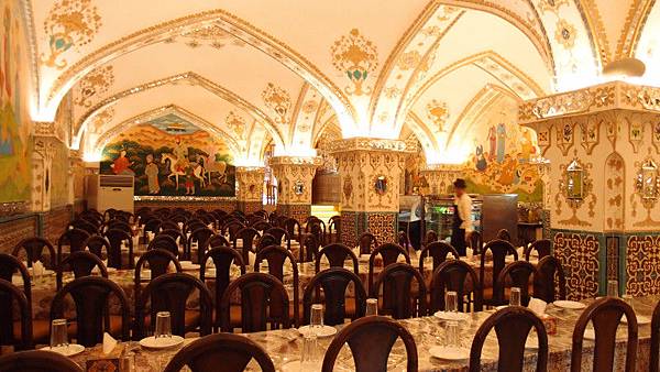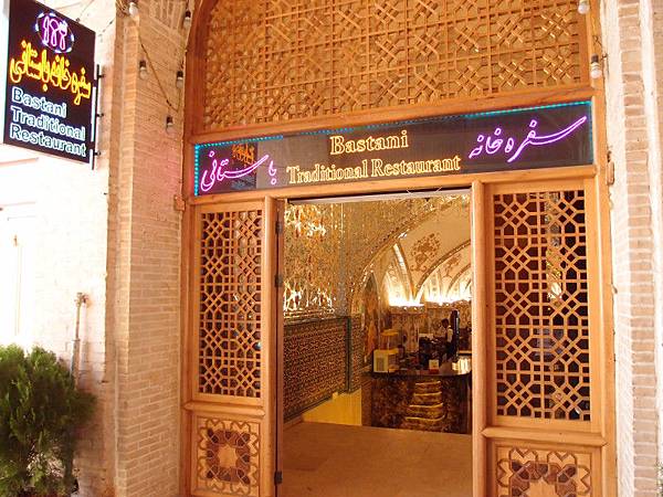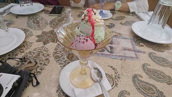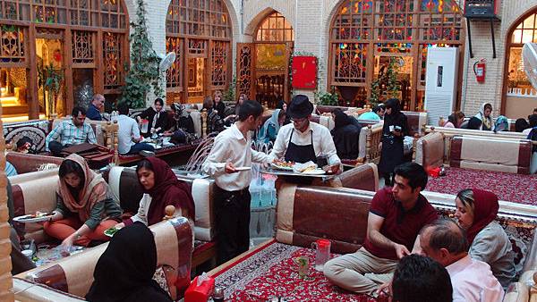 不經不覺在清真寺停留一小時, 下午3點室外天氣還是很熱, 於是到非常受歡迎的餐廳 Bastani 歇腳。餐廳裝修很有波斯氣氛 中庭伊朗特色的梳化很多人, 我們只好坐在一般座位, 只點了雪糕 (6k Toman) 味道很一般。