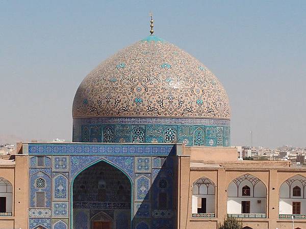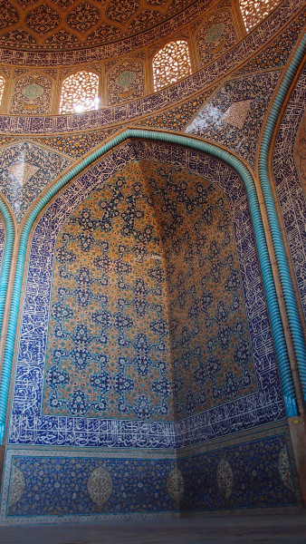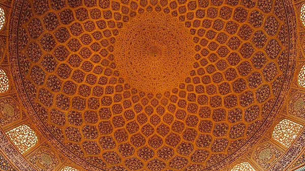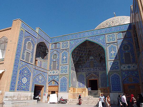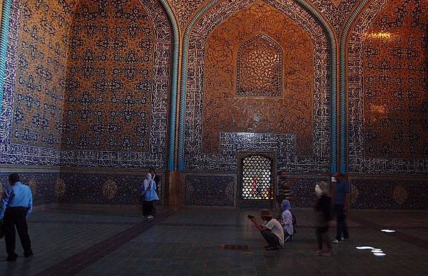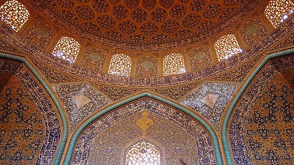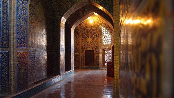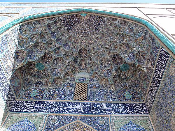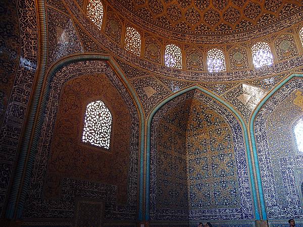 雖然清真寺面積不是很大, 但藍色馬賽克磁磚藝術實在是太厲害。伊朗清真寺最大特色是它的結構, 為了配合圓形穹頂及四方形牆壁, 先在四方牆壁蓋上八角形的牆壁, 再再蓋上十六角型牆壁, 最後圓形穹頂跟牆壁完美密合。牆面磁磚圖案極為繁複, 目不暇給。
