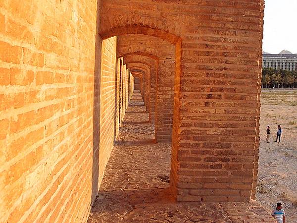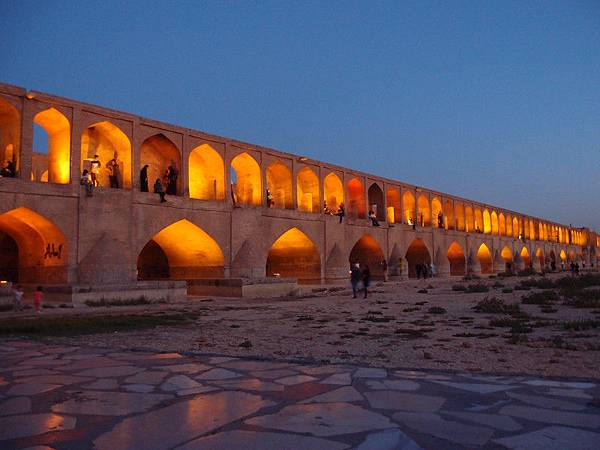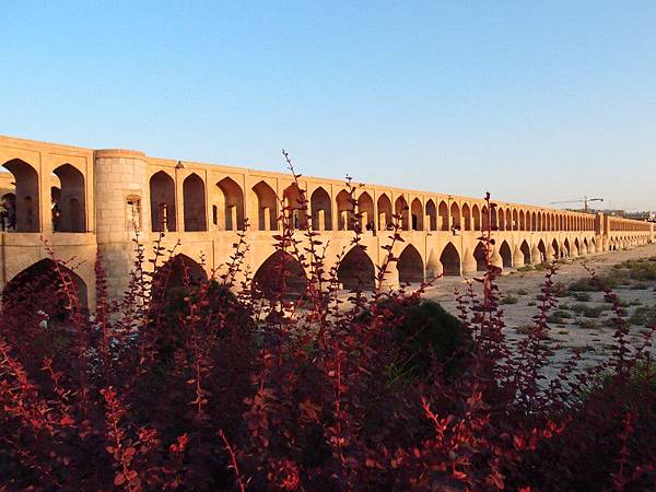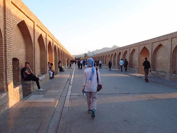 之後回酒店休息, 待傍晚6點多太陽落山再出動往三十三孔橋, 由酒店只需步行15分鐘便到達河岸。三十三孔橋 (Si-o-se Pol, سی و سه پل) 傍晚開始熱鬧起來, 越夜越多年青人出來活動, 我們亦不時跟他們搭訕及合照。7點多開始亮燈更靚, 可惜冬季橋底沒有河水, 否則水面反射倒影更好。