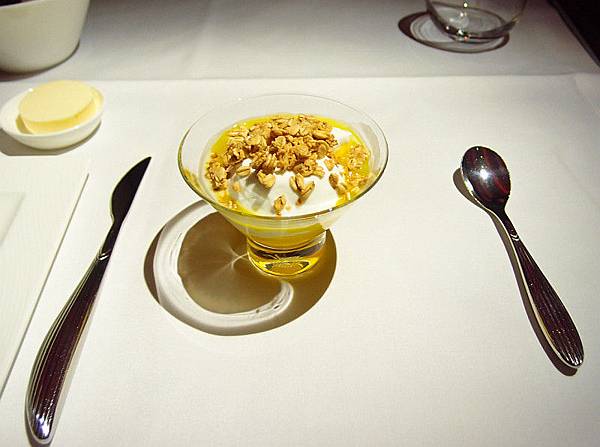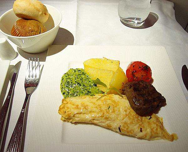 由於是零晨起飛, 預期乘客會盡快睡覺, 餐點有所不同。預設的第一餐是 Late Night Dining, 比去程時減省了前菜, 主菜亦相對簡單菜色。第二餐則是早餐。