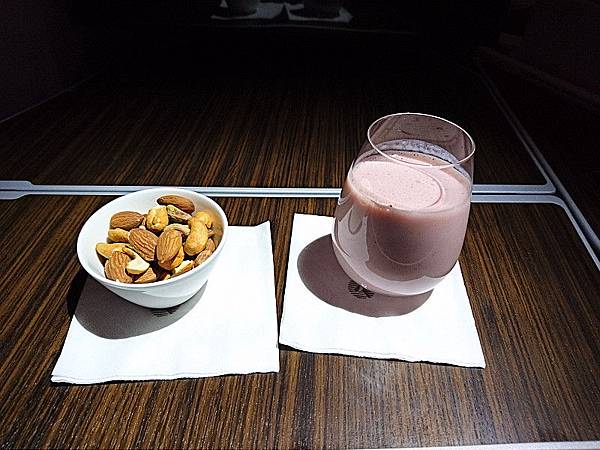 起飛後一小時開始用餐, 先上飲品及果仁。老婆嘗試新飲品 Strawberry & Fig Smoothie。