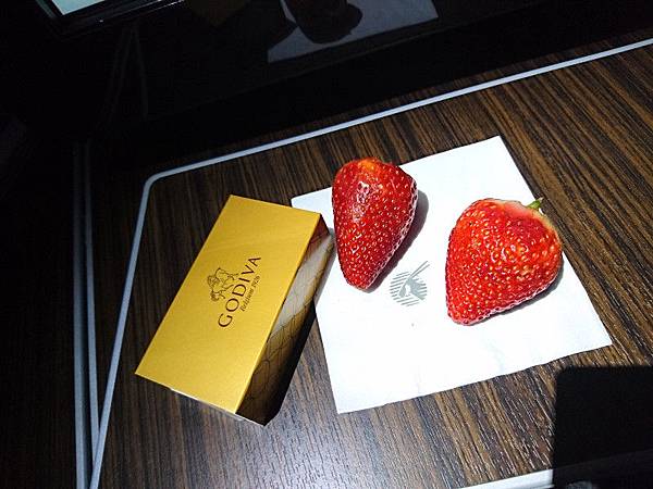空姐送上朱古力, 我們再到商務艙後方小型酒吧區拿士多啤梨享用。