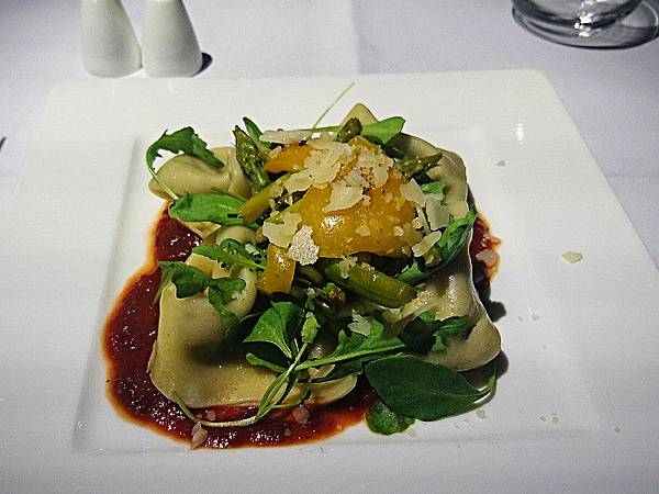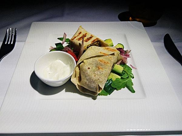 用餐後小睡3小時後起床, 空姐快便前來詢問是否需要用餐。我們先梳洗一下, 老公好奇到酒吧區試飲香檳。不久空姐送上預訂的晚餐, 分別是鷹嘴豆卷餅配乳酪 及 茄子義大利雲吞。份量都很大, 味道也不錯。老婆還點了飲品mocktail apple cooler, 很喜歡。