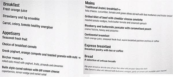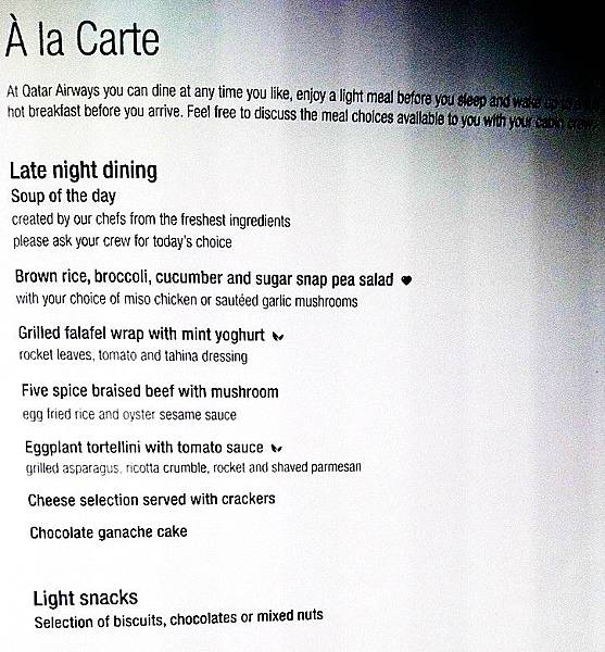 由於我們在貴賓室已睡覺, 加上抵達香港是傍晚時間, 因此空姐替我們點餐時我們要求更改用餐次序, 先食早餐, 落機前才食晚餐。這樣一方面可以適應時差, 又可以盡量享用商務艙的服務。Qatar 商務艙的餐飲最大好處是可以按自己需要安排用餐時間及預留喜歡的食物。如果拿不定主意, 空姐亦很樂意提供意見及推介, 雖然坐我們旁邊的兩位台灣大嬸英文不太靈光, 餐牌亦只有英文, 空姐亦很有耐性介紹餐牌上的食物, 絕無半點不耐煩的態度。