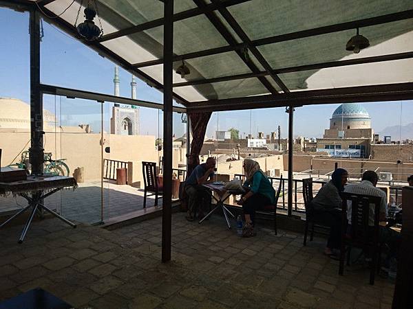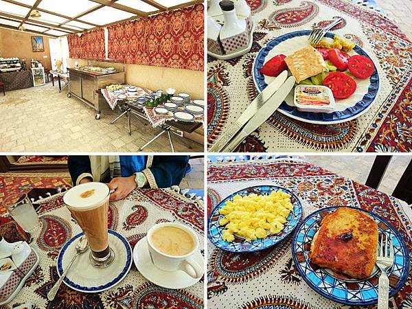 早餐位於天台餐廳, 風景很好, 可以眺望清真寺。除一般伊朗式自助早餐外, 還可以加點一份即叫即做的菜色, 我們選了法式多士及炒蛋。味道很好。另外點了2杯意大利咖啡 (US$2/杯), 味道正宗。這是在伊朗2星期最豐富的早餐。第二天早上要趕8點巴士往 Shiraz, 酒店亦準備麵包及水煮蛋給我們帶走。