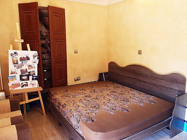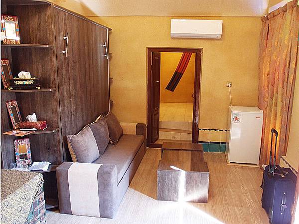 我們在 Isfahan 時透過whatsapp訂房, 雙人大房原價 US$66/晚, 住2晚特價 US$60。一如其他伊朗酒店, 職員先幫客人預留貴價的大房。我們入住時發現房間很大, 左邊有一張大雙人床, 右邊是長梳化, 其實梳化後面的木櫃可以拉下變成另一張雙人床, 容納4個人都無問題。
