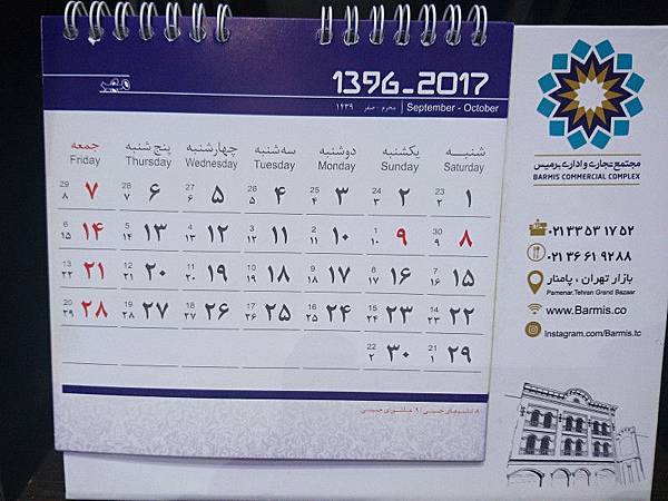 伊朗有自己的曆法, 車票上的日子都是用伊朗曆法, 西曆2017年相等於他們1396年。像我們的農曆, 當地部分日曆有2種曆法對照, 特別之處是由右往左看, 星期五是休假日紅色標示 (部分景點及商舖會關門), 例如伊朗曆法1396年7月(Mehr) 7日 (V) 星期五(左上角) 是西曆9月29日。最好是預先準備2種曆法對照, 方便購買車票及核對乘車日期。