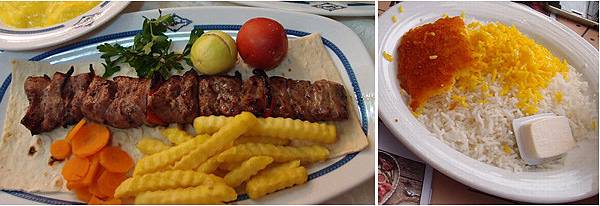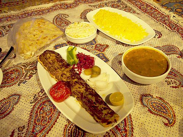 在伊朗用餐最大問題是食物種類少, 除了在大城市有少數西餐廳外, 大部分伊朗菜色基本上都是大同小異, 差不多每天都是 Kabab 烤肉, 只能選擇雞、羊、牛肉, 配米飯及必定提供的烤餅, 份量不少。雖然伊朗米飯相比香港食到的算是偏乾, 幸好大多加入番紅花烹煮, 味道還算不錯。烤餅是大多是放涼了比較乾, 不是現烤口感一般, 沒有印度 naan 好味。